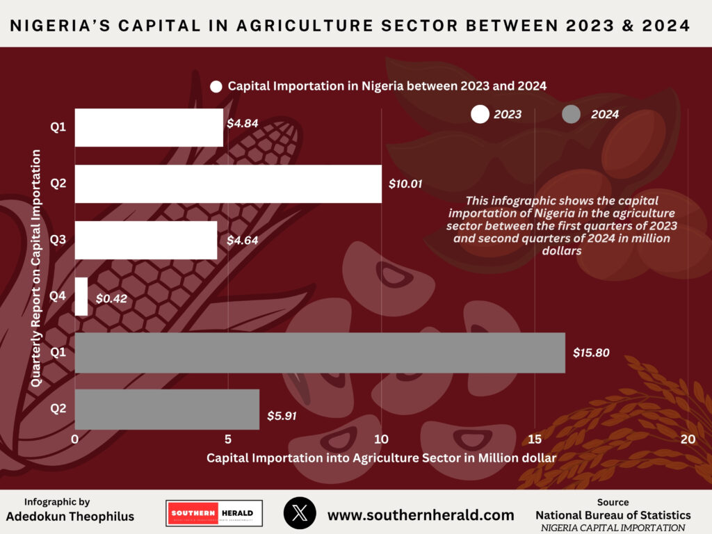 Meanwhile, the National Bureau of Statistics reported that Nigeria’s capital importation into the agriculture sector is $4.84 million in the first quarter and $10.01 million in the second quarter of 2023. NBS recorded $4.64 million and $0.42 million in the third and fourth quarters of the same year. $15.80 million and $5.91 million were recorded in the first and second quarters of 2024.