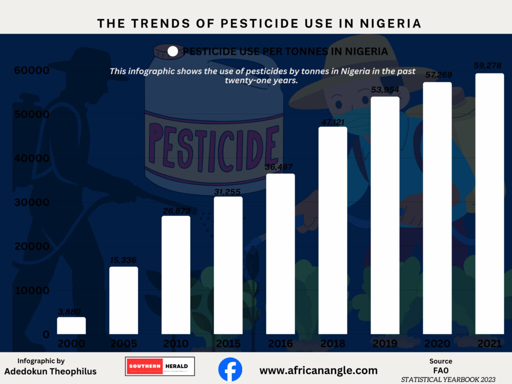Data by the Food and Agriculture Organisation (FAO) showed that Nigeria’s use of pesticides in farming has tremendously increased over the 20 years between 2000 and 2021.