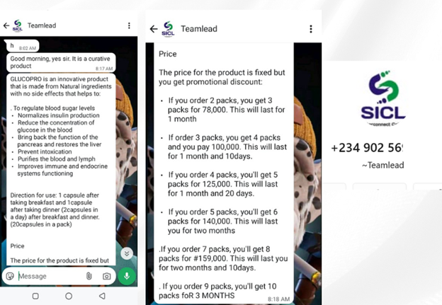 To boost credibility, the group administrators and promoters frequently pretend to be satisfied customers or health professionals, posting testimonials and before-and-after images. They frequently refer prospective customers to WhatsApp or Facebook inboxes for private conversations, which are where the actual transactions occur. The group members are urged to buy these supplements passed off as curative drugs at exorbitant prices, with vague promises of curing diabetes or flushing out sugar from the body. There is no scientific evidence provided, and attempts to challenge the claim and complaints from past customers are usually ignored.