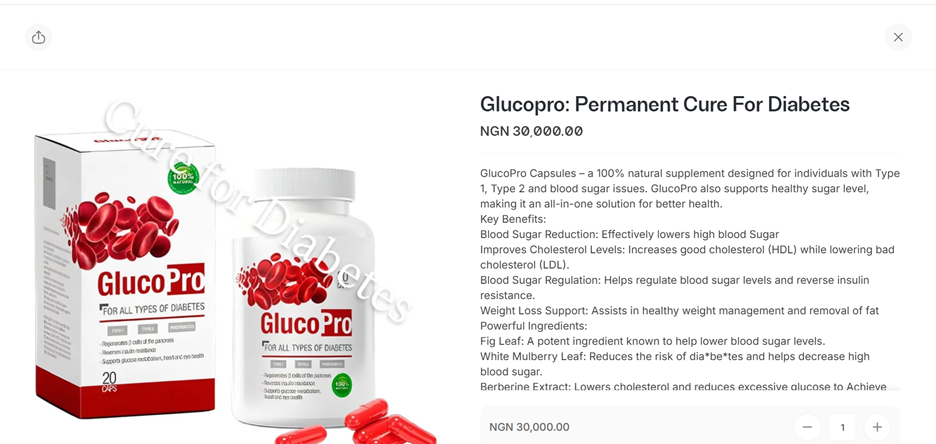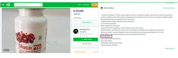 It was also discovered that GlucoPro was available for purchase on e-commerce sites Jumia and Jiji as a health product for diabetes and hypertension. Misleading health claims, unverified medical promises, and scientifically unsupported claims are used to describe the product on both platforms, which could put customers at risk, especially those who are treating diabetes or prediabetes.