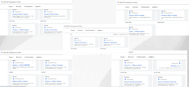 While Meta platforms (Facebook and Instagram) appear to be the primary channels used to promote these medications, it was also observed that the actors deployed Google Ads as part of their broader digital marketing strategy to reach a wider audience. A search on the Google Ads Transparency Centre revealed that products such as GlucoPro, Insulux, Xenorpost, Spasmair, Fast Active, Cardioton, and Metabon have been actively promoted through Google Ads targeting users in Nigeria, Tanzania, Cameroon, and South Africa.