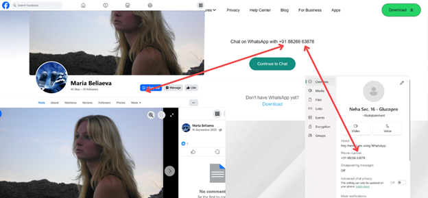 Glucopro-Honduras, one of the pages found during an analysis on Facebook in November 2024, contained an Indian registered phone number connected to a dormant Facebook account named Maria Beliaeva and a business WhatsApp account with the business name Nutratainment. After subjecting the account profile picture to Yandex reverse image search, it was discovered that the photograph belonged to a Russian person by the name of Nadezhda Kotkova.
