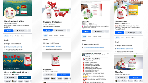 Because the page profiles and groups are faceless and function as corporate accounts with no identifying individual or corporation associated with them, it is difficult to verify the validity of the materials they display. The GlucoPro campaign makes use of this loophole. By emulating legitimate firms’ promotion strategies in marketing and customer engagement and using Meta’s ad platform, it earns unjustified validity in the eyes of followers, many of whom believe GlucoPro effectively treats high blood pressure or diabetes.