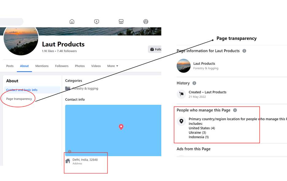 One of the Facebook pages monitored, Eco Puzzling, sets its location in Aja, Lagos State, Nigeria, and Laut Products in Delhi, India. However, Facebook uses IP addresses to determine where a page is operating from. Other pages also set their different locations based on what the Facebook page transparency section provided about where the pages are being managed.Facebook shows the location of where the pages are being run from.