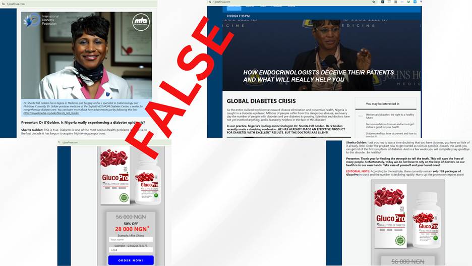 One of the subdomains had a Channel Television logo and used Bennet Ifeakandu Omalu, a Nigerian-American physician, forensic pathologist, and neuropathologist who was the first to discover and publish findings on chronic traumatic encephalopathy, falsely describing him in a published interview as a cardiovascular surgeon and specialist at the Department of Endocrinology who developed a permanent diabetes cure called GlucoPro. Another subdomain used his images and name to promote a diabetic drug called DiabeCode.