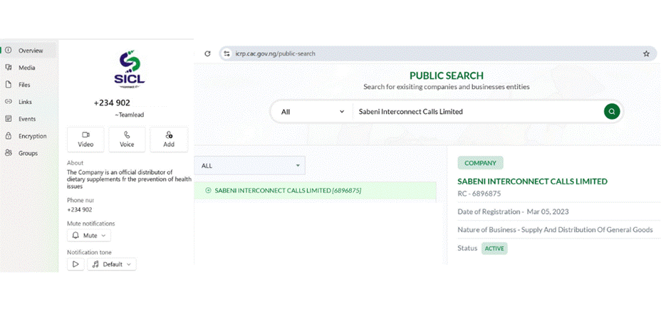 Screenshot of Sabeni Interconnect Calls Limited’s WhatsApp Business account and CAC search result.