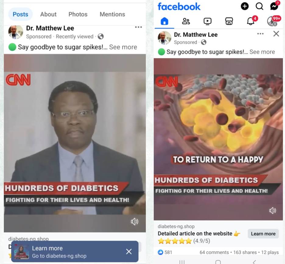 Similarly, a Facebook page purportedly belonging to a medical doctor, Dr Matthew Lee, featured Arise TV presenter Ojy Okpe and the CNN logo in a sponsored article about diabetes set against the backdrop of Arise TV. It promoted a 98% effective blood pressure-lowering medicine and sent users to a link for purchases. However, a Google reverse image search revealed that the profile picture, purportedly of Dr Lee, was actually that of Dr Robert Kruger, a physician in the U.S. Air Force. A Meta Ad Library analysis of the page revealed that 16 posts, 15 in Arabic and one in English that were intended for Nigerian users, were published in June 2024.