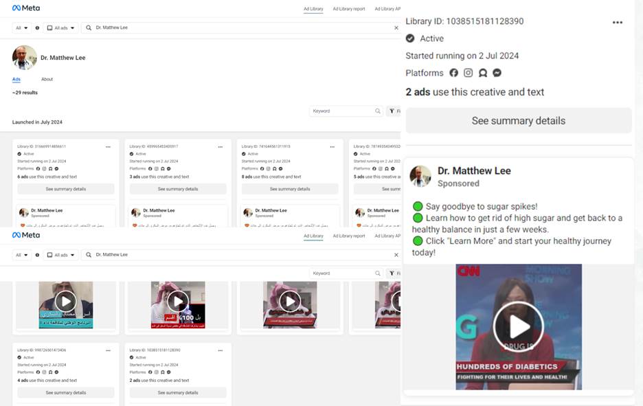 Meta-ad library of Dr. Matthew Lee’s page