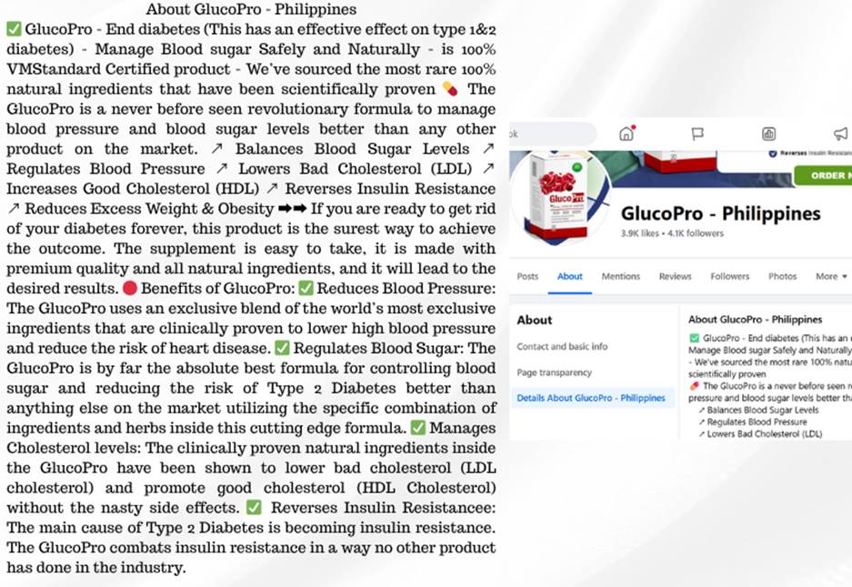 A Facebook profile called GlucoPro – Philippines, which has over 4,100 followers, is the administrator of the GlucoPro Facebook group. The page and group both make unapproved medical claims under the about section, such as that GlucoPro “ends diabetes and gets rid of your diabetes forever.” It makes the false and scientifically unsupported claim that it can treat or cure both type 1 and type 2 diabetes.