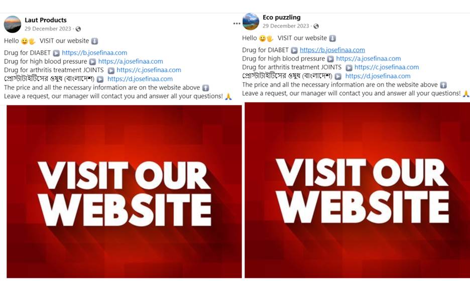 Both pages were observed to have the same post published on December 29, 2023, on their timelines calling for website visits for curative health products for diabetics, blood pressure, arthritis, and prostatitis, all written in English, and another in Bangla, the official language of Bangladesh. The videos that went with the posts generated thousands of views and received hundreds of comments from those who wanted to know how to buy the health product with the supposed curative properties .