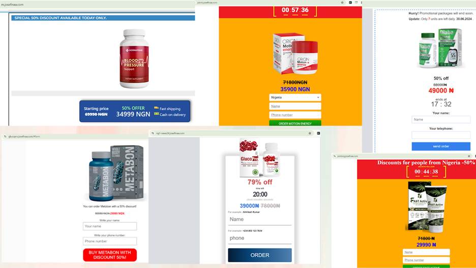 These included having page sections on Josefinaa.com in Swahili, German, Malay, English, Bangla, Hindi, French, and Spanish, all of which were used to promote unlicensed health products marketed as cures for diseases.